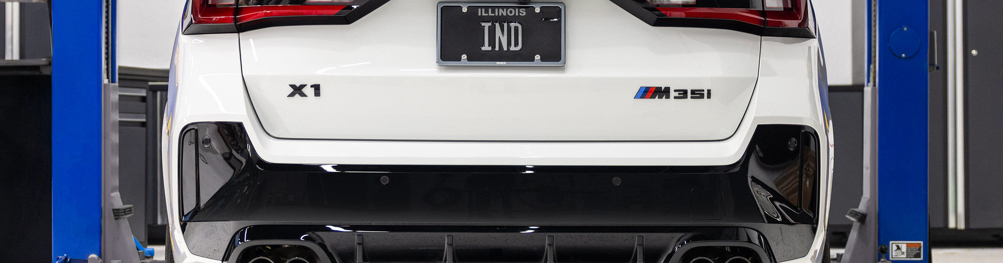 Is this the ideal modern BMW daily driver? We think it just might be. When Chris from IND was in the market for a new daily for his wife, the choice was clear: the new BMW X1 M35i. As BMW’s SUV lineup continues to grow in size, the U11 X1 remains surprisingly compact measuring very close to the first-generation E53 X5 in overall width making it a perfect balance of agility and practicality. Chris opted for a timeless spec: Alpine White (paint code 300) paired with striking red and black perforated interior. Straight from the factory, the vehicle arrived with chrome “X1” and “M35i” badges—those were immediately replaced with IND’s gloss black emblem set, giving the car a more cohesive, aggressive factory+ look. The gloss black finish not only elevates the rear-end styling but also complements the factory rear diffuser. To complete the rear-end transformation, we installed IND’s painted rear reflector inserts, color-matched to BMW gloss black. Painted in-house at IND, these inserts seamlessly blend into the rear bumper and further refine the visual balance. The final result? A clean, OEM+ appearance that looks like it could have rolled off the production line this way.
