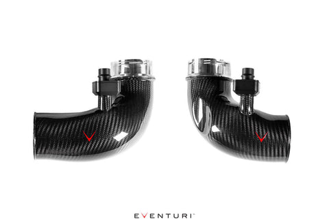 Presenting the perfect addition to Eventuri's F90 M5 intake system to optimize the flow path all the way to the turbos. These carbon inlets have a larger volume than the stock inlets by maintaining a larger diameter all the way to the turbos. The stock inlets narrow down immediately after the connection to the intake which creates a restriction especially at higher boost levels. Eventuri has alleviated this restriction and also designed the curvature to be as smooth as possible allowing the turbos to reach peak boost sooner.