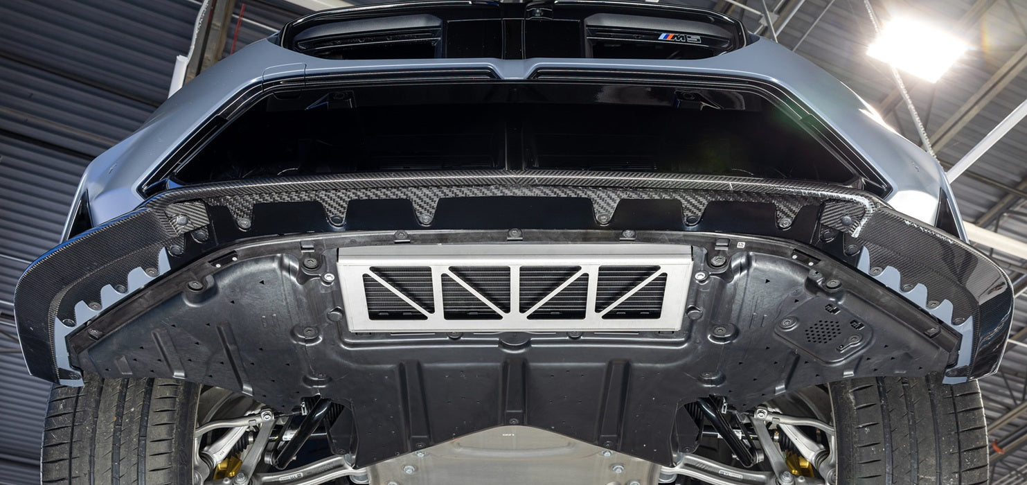As an added benefit, the leading edge of the 'protection cage' extends down into the airflow beneath the car. Anyone familiar with the airfoil that BMW installed at the leading edge of the oil cooler on G8X cars will know that as the air has to flow around this piece, it creates a slight vacuum effect, thus pulling the air through the cooler and marginally increasing its efficiency.